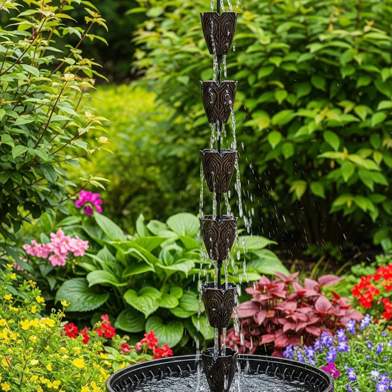 Replace boring downspouts with rain chain fountains that turn drainage into decorative features! These Japanese-inspired chains guide rainwater from gutters to ground level in beautiful cascades. During dry spells, add a pump system to recirculate water, maintaining the effect year-round. Choose from traditional cup styles or modern link designs in copper, aluminum, or brass. Install a basin at the bottom to catch water, adding a pump for continuous flow. The vertical design takes minimal ground space while creating maximum visual impact. Water dancing down chains creates unique sounds different from traditional fountains. Position near windows where you can enjoy the view during storms. Some creative gardeners combine multiple chains for fuller effects. This functional art piece manages water while adding architectural interest to your home's exterior.