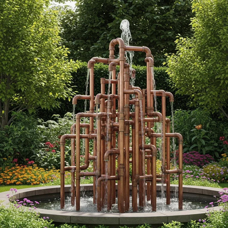 Embrace industrial aesthetics with a copper pipe fountain that turns plumbing supplies into art! This DIY project lets you create custom designs limited only by imagination. Use copper pipes, elbows, and tees to build geometric structures or organic shapes. The warm metal tones develop beautiful patinas over time, adding character. Create multiple water outlets at different heights for cascading effects, or focus on a single dramatic spout. Solder connections for permanence or use compression fittings for adjustable designs. The exposed pipe aesthetic works perfectly in modern gardens or as contrast against traditional plantings. Add valve controls to adjust individual water flows, creating different sounds and patterns. As copper ages, it develops gorgeous blue-green patinas that make each fountain unique. Industrial never looked so elegant!