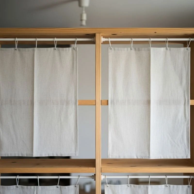A5: Fabric curtains using clearance material or repurposed sheets cost under $20 per shelf.