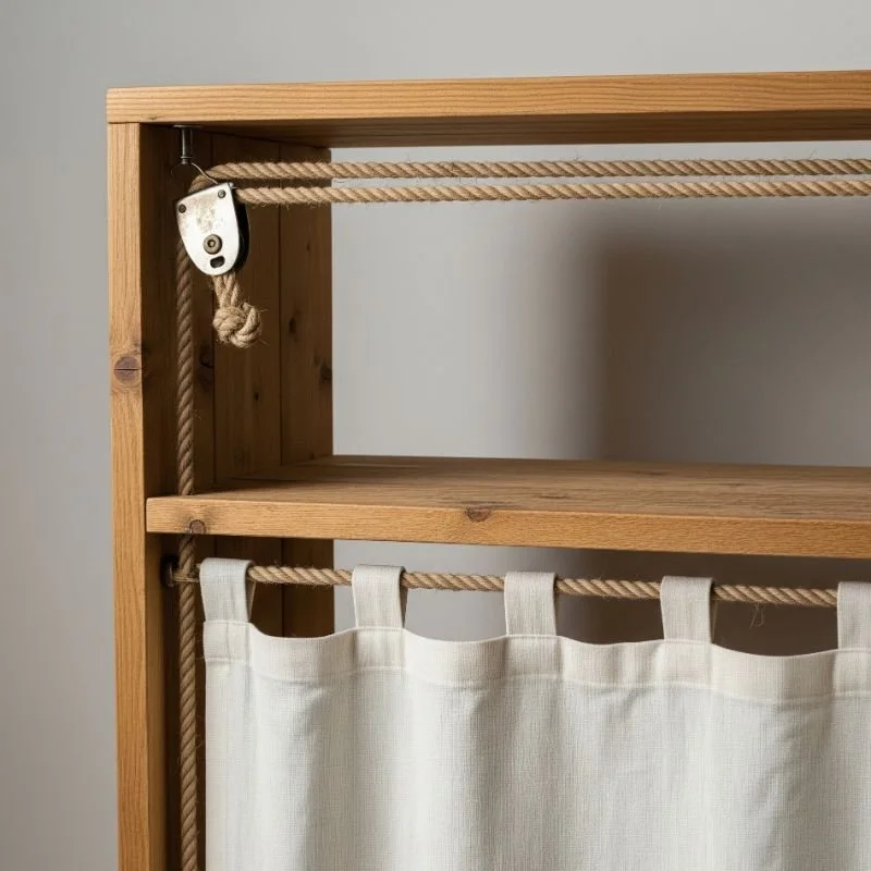 Engineer a nautical-inspired covering system using rope and pulleys that adds maritime charm while providing adjustable coverage. This creative approach uses boat cleats and marine-grade rope to raise and lower fabric panels like sails. The exposed rope and hardware become decorative elements that enhance coastal or industrial themes. It's like turning your shelves into a sophisticated ship's storage! Install pulleys at ceiling height and cleats at comfortable reaching level. Use canvas or sailcloth for authentic nautical appeal. The mechanical nature of this system appeals to those who appreciate visible functionality. This solution works particularly well in beach houses, kids' rooms with nautical themes, or any space where you want to add kinetic interest.