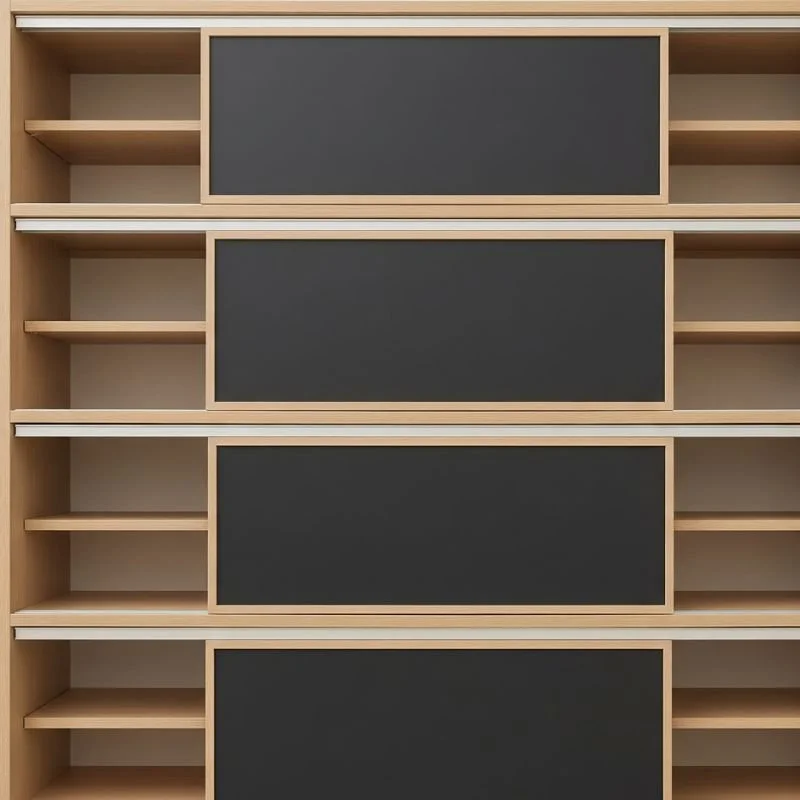 Create functional art by installing sliding chalkboard panels that hide shelves while providing a creative canvas. These dual-purpose covers transform storage areas into message centers, menu boards, or children's art spaces. Use chalkboard paint on lightweight panels that glide smoothly on tracks. It's like having an ever-changing mural that hides your clutter! The matte black surface adds dramatic contrast in light-colored rooms or blends seamlessly in darker spaces. Include a chalk ledge at the bottom for convenience. This solution particularly suits kitchens, playrooms, or home offices where communication and creativity matter. Change messages seasonally or daily depending on your needs. The erasable surface means your shelf covers never look the same twice.
