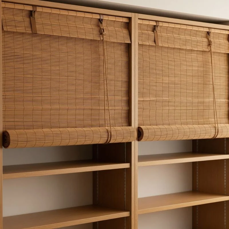 Install bamboo blinds for an eco-friendly covering solution that brings natural texture and adjustable coverage to your open shelves. These ready-made blinds can be cut to fit various shelf sizes and roll up completely when you want full access. The natural bamboo filters light beautifully if your shelves are near windows, creating interesting shadow patterns. It's like giving your shelves sustainable sunglasses! Mount blinds inside the shelf frame using small brackets, ensuring smooth operation without catching on shelf contents. The organic material complements both modern and traditional décor styles. Choose from different bamboo stains to match your furniture. This solution works particularly well in sunrooms, kitchens, or any space with an organic, natural design theme.