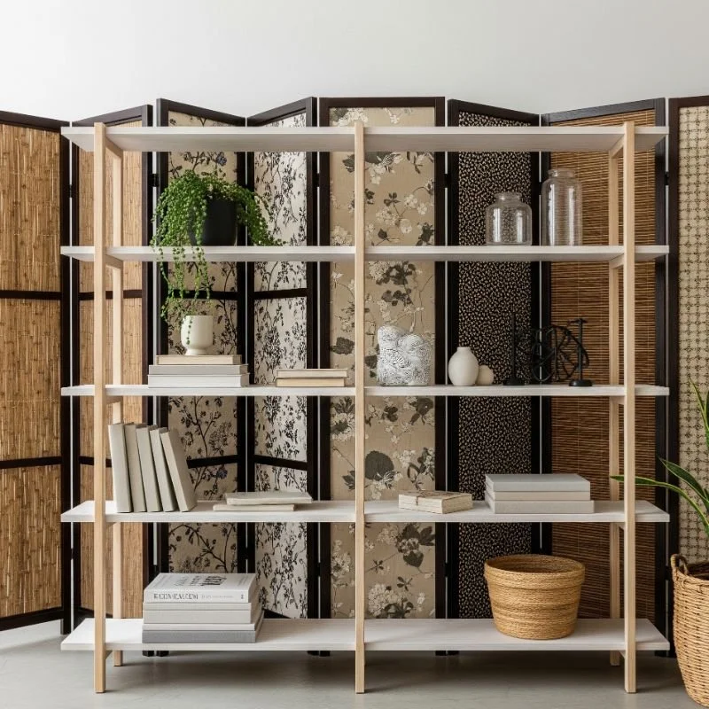 Adapt folding room divider screens into stylish shelf covers that can be easily moved or adjusted as needed. These portable solutions require no installation, making them perfect for renters or those who frequently rearrange. Choose from various styles like carved wood, fabric panels, or modern geometric designs. It's like having a portable privacy fence for your storage! Position screens in front of shelving units, angling panels to allow partial access while hiding messy areas. The freestanding nature means you can remove them entirely when deep cleaning or reorganizing. Mix and match panel styles for an eclectic look. This solution works especially well for large shelving units or when you need to hide only certain sections.