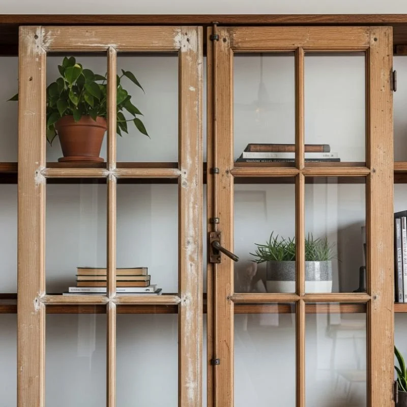 Repurpose old window frames into charming hinged doors that add architectural interest while concealing shelf contents. Hunt for frames at salvage yards, estate sales, or online marketplaces, selecting sizes that fit your shelf openings. Leave glass intact for see-through storage or replace with fabric, chicken wire, or decorative paper for opacity. It's like creating a cabinet from historical architectural elements! Sand and paint frames to match your décor or preserve their weathered patina for authentic vintage appeal. Attach with small hinges for easy opening. This upcycling approach adds character while keeping materials out of landfills. The window panes create interesting display sections when you want to showcase certain items. This solution perfectly suits cottage, farmhouse, or eclectic design styles.