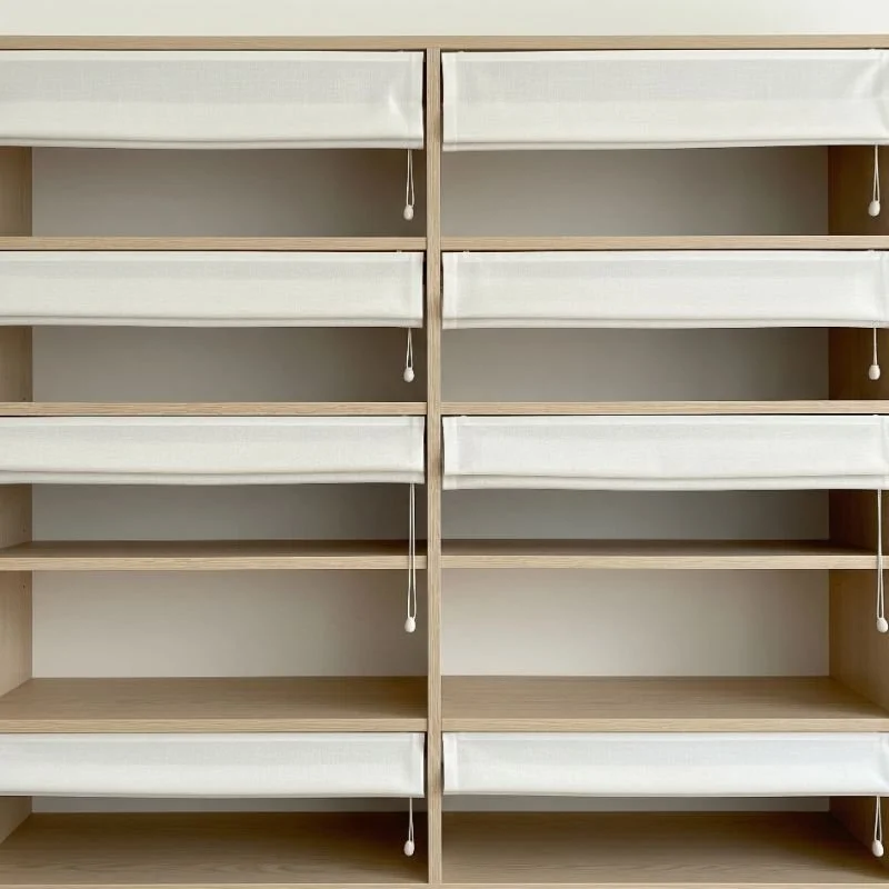 Elevate your shelving with sophisticated Roman shades that bring window treatment elegance to storage solutions. These fabric shades fold neatly when raised, stacking in attractive pleats that add architectural interest even when shelves are exposed. When lowered, they provide complete coverage with a tailored, professional appearance. It's like dressing your shelves in a perfectly pressed suit! Create shades using medium-weight fabric, dowels for structure, and a simple cord system for raising and lowering. The key is precise measurements and evenly spaced folds. This solution particularly suits living rooms, bedrooms, or any space where you want refined style. Choose fabrics that coordinate with your window treatments for a cohesive look throughout the room.