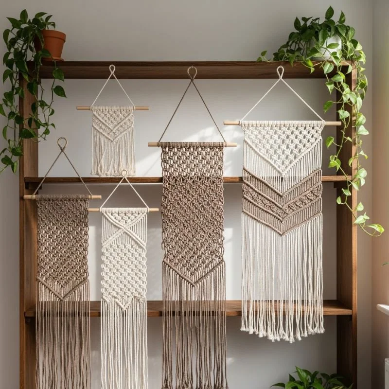 Channel boho vibes by crafting macramé screens that artfully obscure shelf contents while adding textural interest to your space. This trendy technique uses knotted cord or rope to create patterns ranging from simple to intricate, allowing glimpses of what's behind while softening the overall view. The handmade quality adds warmth and personality that store-bought solutions can't match. It's like hanging textile art that happens to hide your stuff! Start with a wooden dowel or metal rod as your anchor, then follow patterns or freestyle your design. Natural cotton rope works beautifully, or experiment with colored cords for a modern twist. This option suits eclectic, bohemian, or modern spaces where texture plays a key role in the design scheme.