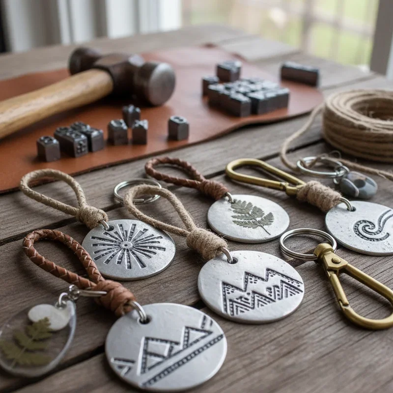 Create lasting impressions with metal stamped keychains carrying personalized messages! Using metal blanks, letter stamps, and a hammer, impress words that inspire, commemorate, or amuse. This technique requires practice for even spacing and depth, but results look professionally made. Choose from aluminum for easy stamping, brass for vintage appeal, or copper for warmth. Stamp names, dates, coordinates of special places, or motivational quotes. Darken impressions with permanent marker or liver of sulfur for contrast. Add patina or polish for different finishes. These keychains make meaningful gifts for graduations, deployments, or memorials. The permanence of stamped metal carries weight both literally and figuratively. Some crafters combine stamping with wire wrapping or add birthstone charms for extra personalization. While initial investment in stamps seems high, they last forever, making this cost-effective for creating multiple keychains.