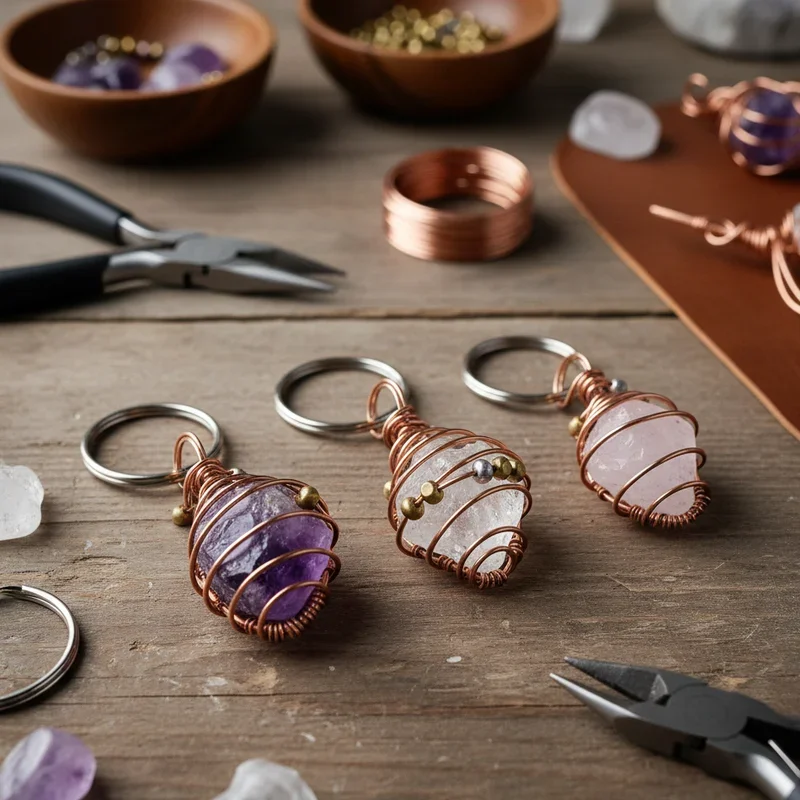 Harness the natural beauty and supposed energy of crystals with wire-wrapping techniques! This project combines metalwork basics with crystal healing trends, creating keychains that are both beautiful and meaningful. You'll need crystals or stones, jewelry wire, and basic pliers. Choose crystals based on appearance or properties; amethyst for calm, rose quartz for love, or clear quartz for clarity. Start by creating a wire cage or spiral wrap around your crystal, ensuring it's secure while showcasing the stone's natural beauty. Add decorative swirls or smaller beads to the wire design for extra detail. These keychains make thoughtful gifts, especially when you match the crystal to the recipient's needs or birthstone. The combination of natural stone and handcrafted metalwork creates an artisan feel that looks far more expensive than it actually is.