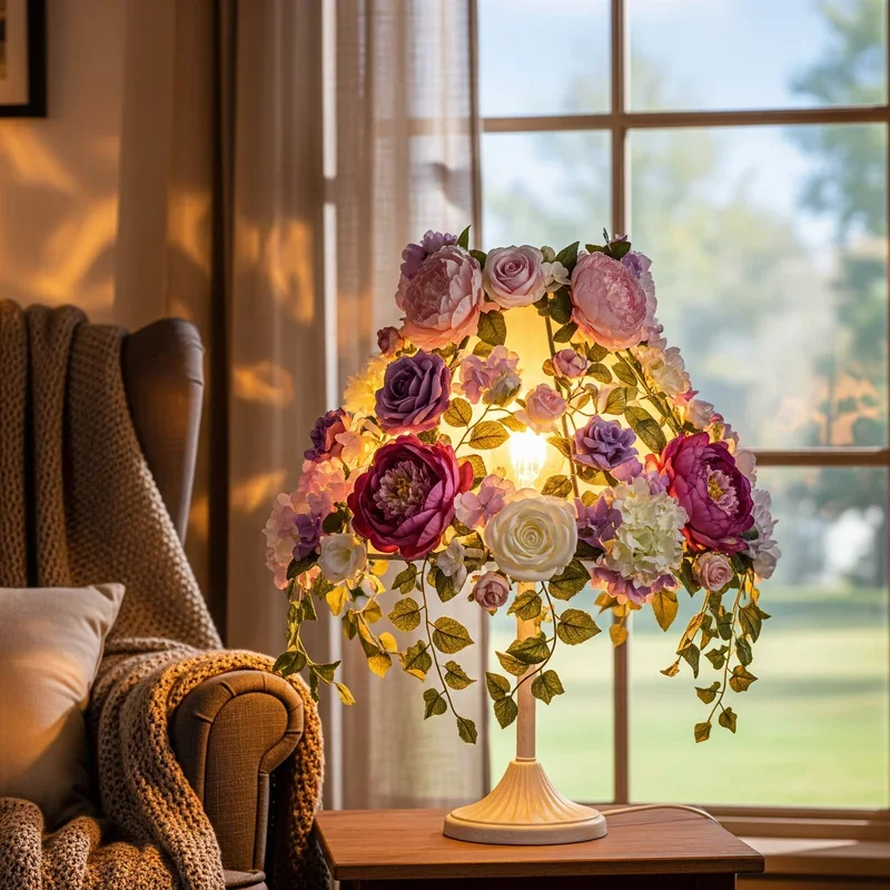 Create a blooming masterpiece by adorning your lampshade with handmade fabric flowers that never need watering. This romantic design involves cutting fabric circles, heating the edges to curl them naturally, and layering them into dimensional blooms. You can use old clothes, vintage fabrics, or coordinating materials that match your room's color scheme. The flowers can cover the entire shade for maximum impact or be arranged in elegant clusters for a more subtle effect. Mix different flower sizes and types to create depth and visual interest. This project particularly shines in bedrooms, nurseries, or any space that needs a feminine touch. The soft fabric diffuses light beautifully, creating a gentle glow perfect for relaxation.