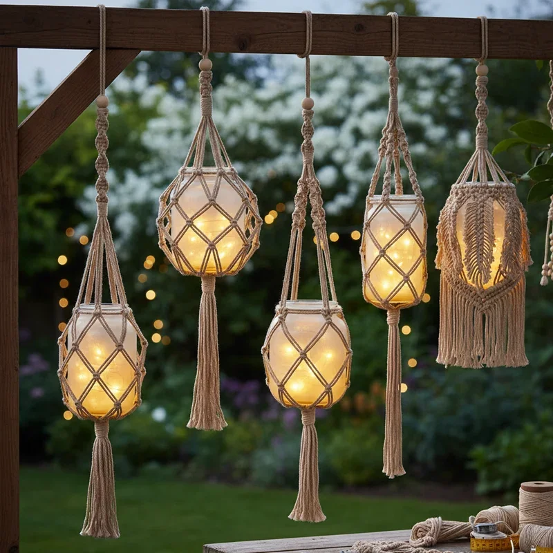 Weave bohemian-style macramé holders that cradle glass containers or existing lanterns in intricate knotted designs! Learn basic macramé knots like square knots and half hitches to create net-like structures that support various vessel shapes. Use natural cotton rope for authentic boho vibes or colored cord for modern twists on traditional techniques. Incorporate wooden or metal rings at tops for hanging points and beads throughout designs for added decoration. These holders transform simple glass bowls or jars into suspended lanterns that sway gently, creating moving shadows and dynamic lighting. The open weave allows maximum light emission while adding textural interest even when lanterns aren't lit. Perfect for covered patios or indoor spaces where ceiling height allows for dramatic hanging displays.