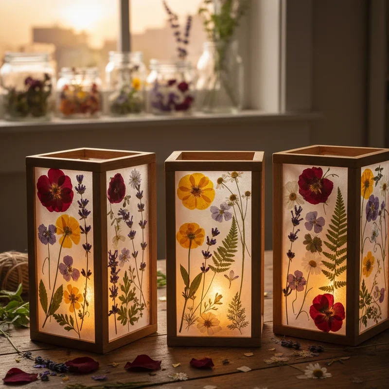 Preserve nature's beauty in translucent lanterns featuring real pressed flowers suspended between glass or paper layers! Press flowers and leaves between heavy books until completely dry and flat, selecting specimens with interesting colors and shapes. Arrange pressed botanicals between two pieces of glass held in simple frames, or laminate between wax paper sheets for paper lanterns. Position LED candles behind botanical panels for backlighting that highlights delicate flower details and natural colors. These lanterns bring garden beauty indoors year-round, preserving summer blooms for winter enjoyment. Create seasonal versions with spring blossoms, autumn leaves, or winter evergreens for year-round variety. The organic elements add romantic, cottage-style charm perfect for weddings or garden parties.