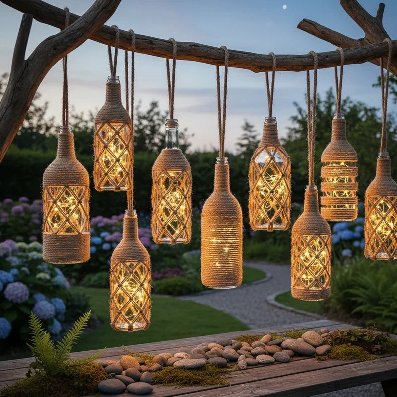 Wrap glass bottles or jars with rope or twine for nautical-themed lanterns that bring coastal charm inland! Start at bottle bottoms, securing rope with hot glue and wrapping tightly in continuous spirals to tops. Leave windows unwrapped for light emission or create patterns with wrapped and unwrapped sections. Use different rope thicknesses or colors for varied textures and visual interest. Add shells, starfish, or nautical charms for enhanced beach themes that complete the coastal look. Insert candles or battery lights through bottle openings, creating portable lanterns perfect for beach houses or maritime-themed events. The rope provides insulation, making bottles comfortable to handle even when internal candles warm glass. These durable lanterns withstand outdoor conditions while maintaining their charming appearance.