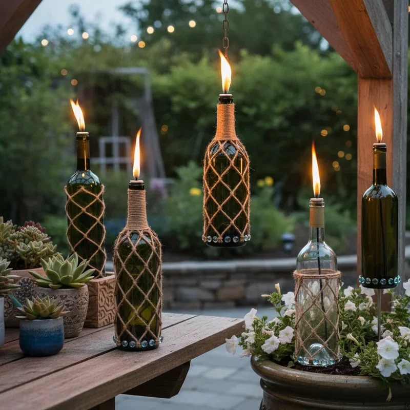 Convert empty wine bottles into elegant torch lights that bring resort-style ambiance to patios and gardens! Purchase torch wicks and metal coupling hardware from craft stores, fitting them into bottle openings for secure flame holders. Fill bottles with citronella oil for mosquito-repelling benefits or colored lamp oil for decorative effects. Mount bottles on fence posts using metal clamps or create freestanding holders from copper pipes for portable positioning. The glass bottles protect flames from wind while adding sophisticated style that plastic torches lack. Choose bottles with interesting shapes or colors, or spray paint clear bottles for customized looks. These torches provide both ambiance and functional lighting for outdoor entertaining, creating resort-like atmospheres in your own backyard.