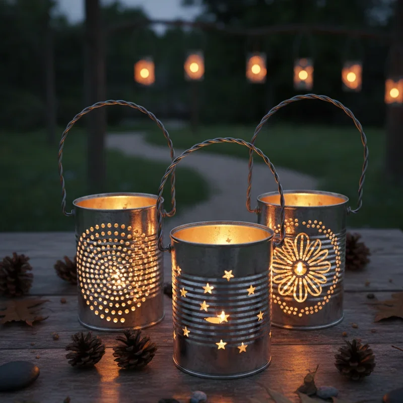 Upcycle empty tin cans into stunning punched lanterns that cast intricate shadow patterns while keeping materials out of landfills! Fill cans with water and freeze solid, providing backing that prevents denting while you hammer nail holes in decorative patterns. Create designs ranging from simple dots to elaborate pictures by marking patterns with markers before punching. Remove labels and paint cans in colors that complement your décor, or leave silver for industrial chic appeal. Add wire handles for hanging options or use as tabletop decorations with candles glowing from within. The metal construction makes these lanterns perfect for outdoor use where paper might not survive weather. Each hole becomes a tiny spotlight when lit, projecting beautiful patterns on surrounding walls and surfaces.