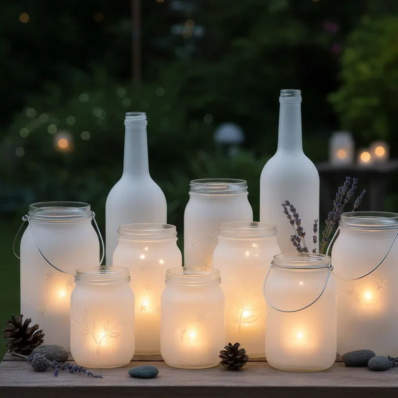 Transform clear glass containers into elegant frosted lanterns using special glass paints that create professional-looking etched effects! Apply frosting spray or brush-on formulas to create solid coverage or use stencils for decorative patterns. Layer different frosting intensities for ombré effects or leave clear windows for light to shine through dramatically. Add metallic accents with gold or silver paint pens for upscale finishes that rival expensive store-bought pieces. The frosted surface diffuses harsh light into soft glows perfect for intimate dining or relaxing evenings. This technique works on everything from mason jars to old vases, giving new life to glassware that might otherwise be discarded. Seal painted surfaces with appropriate topcoats for durability and easy cleaning.