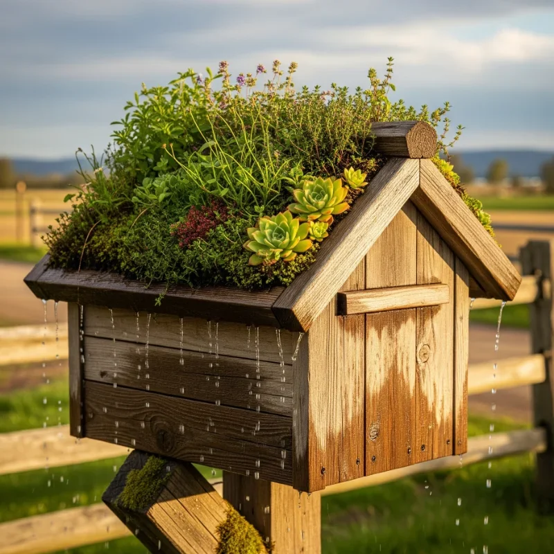 Create an eco-friendly statement with a mailbox featuring a living roof garden on top! Build a wooden mailbox with a flat or slightly sloped roof designed to hold shallow soil. Install proper drainage and waterproof membrane to protect mail storage below. Plant sedums, moss, or other shallow-rooted succulents that thrive in minimal soil. The living roof provides insulation, keeping mail cooler in summer. Rainwater naturally irrigates plants while excess drains away. Edge with copper or aluminum strips for clean finish and root barrier. This sustainable design supports pollinators and reduces stormwater runoff. Choose plants requiring minimal maintenance that survive in your climate. The green roof changes appearance seasonally, flowering in spring and summer. Mount on a sturdy post able to support additional weight when soil is saturated. Your mailbox becomes a tiny ecosystem contributing to environmental health while beautifying your yard!