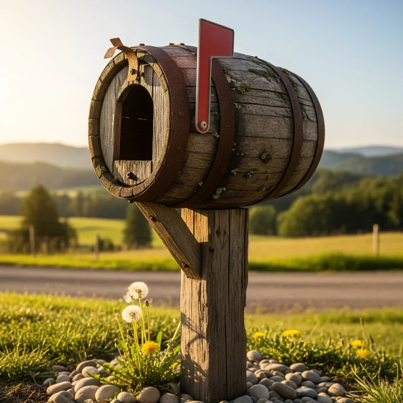 1. Rustic Wooden Barrel Mailbox