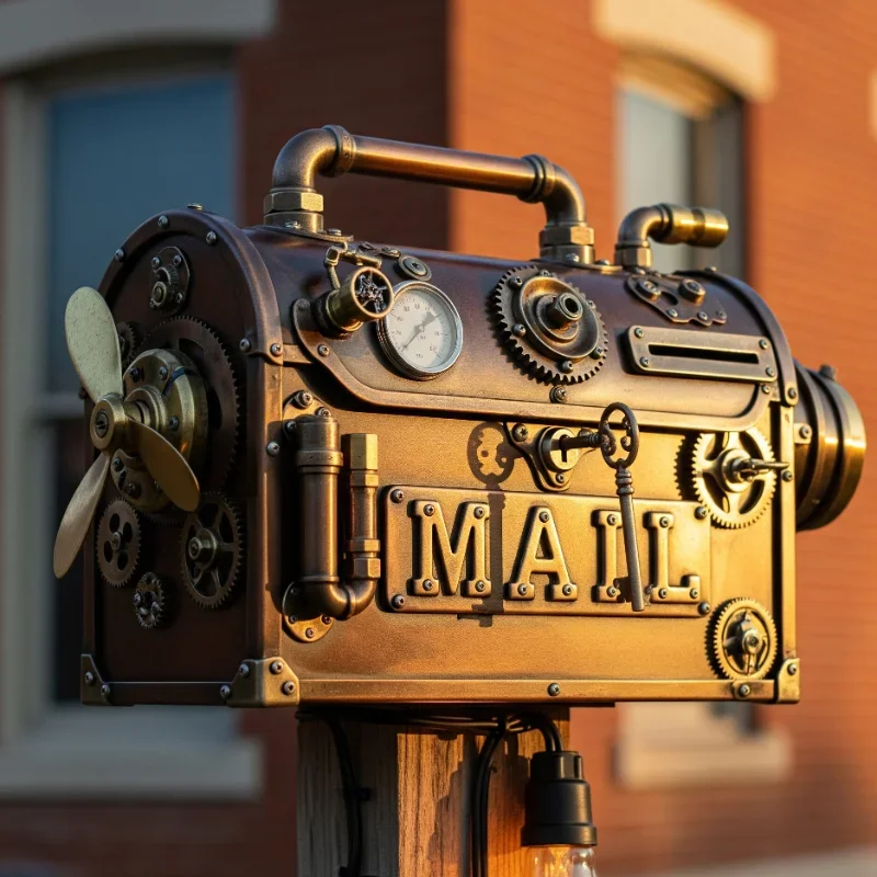 Embrace Victorian-era industrial aesthetic with a steampunk mailbox featuring gears, pipes, and metallic magnificence! Start with a basic metal mailbox and add brass or copper pipes as decorative elements. Attach old gears, pressure gauges, and valve wheels using industrial adhesive or welding. Paint in metallic bronze, copper, or aged brass finishes. Add fake rivets using furniture tacks for authentic industrial appearance. The mail flag becomes a lever or gear mechanism. Include Edison-style bulbs for lighting powered by hidden batteries. Mount on a post wrapped in copper pipes with various gauges and valves. Consider adding a small steam effect using a hidden mister for special occasions. This elaborate design appeals to steampunk enthusiasts and anyone appreciating Victorian industrial style. The metal construction ensures durability while developing attractive patina. Your mailbox transforms into a time machine for daily mail delivery!