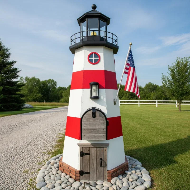 Bring coastal charm to any location with a lighthouse-inspired mailbox that guides mail carriers to your door! Construct the cylindrical tower using PVC pipe or wooden slats arranged in a circle. Paint classic red and white stripes or choose colors that match your home's exterior. The top section houses a solar-powered light that automatically illuminates at dusk, serving as both decoration and practical lighting. Add small windows cut from plexiglass for authentic detail. The mail slot can be disguised as a lighthouse door at the base. Mount on a post wrapped in rope with nautical cleats for hanging decorations. Include maritime elements like a ship's wheel, anchor, or weathered "Beach House" sign. This design works beautifully in any setting, not just coastal areas. Weather-resistant marine paint ensures your lighthouse withstands storms while maintaining its cheerful appearance year-round.