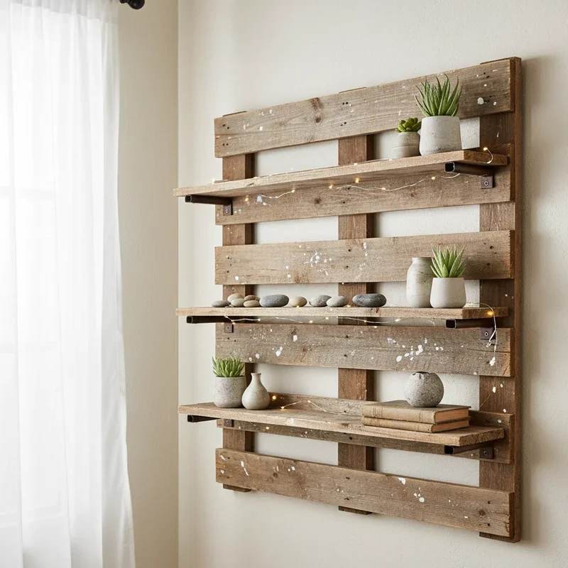 Give your walls purpose and personality with floating shelves crafted from individual pallet boards that create storage with serious style! Carefully dismantle a pallet, selecting the straightest, most attractive boards for your shelving project. Cut boards to your desired lengths, sand them smooth, then mount using concealed brackets for that sleek floating effect. These shelves work everywhere: displaying books in your living room, organizing spices in the kitchen, showcasing toiletries in bathrooms, or holding plants throughout your home. The weathered wood adds instant warmth and texture that sterile store-bought shelves lack. Stagger different lengths at varying heights for dynamic visual interest, or arrange them uniformly for minimalist appeal. You can create corner shelves, long ledges, or even box-style shelving units. The natural wood grain and rustic character make everything displayed upon them look more intentional and curated, elevating your entire décor game effortlessly.