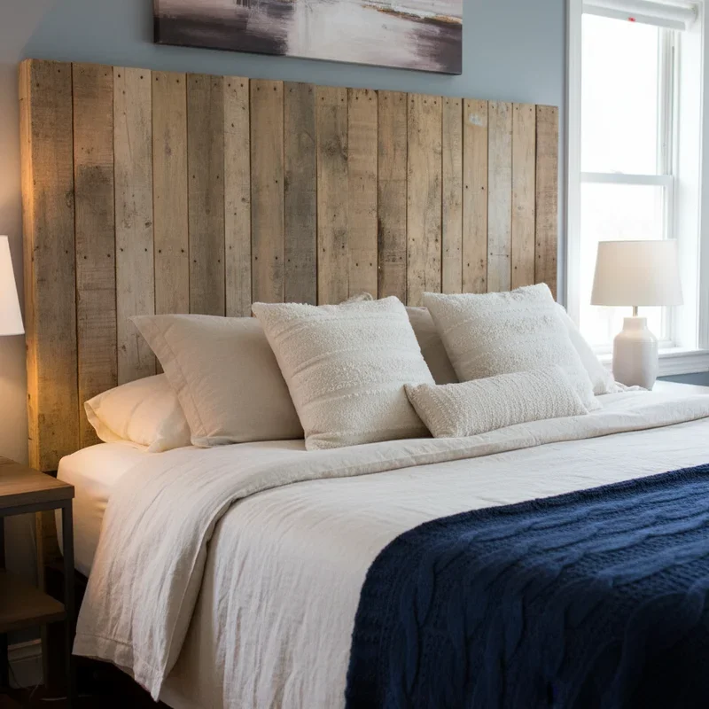 Turn your bedroom into a boutique hotel experience with a dramatic pallet headboard that anchors the entire room! Pallet headboards create focal points that draw eyes immediately upon entering, setting the mood for restful elegance. Stand pallet boards vertically behind your bed, securing them to the wall or creating a freestanding structure. You can keep boards their original width for textured variety, or cut them uniform for cleaner lines. Sand and finish them to your preference, perhaps whitewashing for coastal vibes or staining dark for moody sophistication. Add string lights woven between slats, attach small shelves for bedside essentials, or incorporate hooks for hanging décor. The vertical lines create the illusion of higher ceilings while the substantial wood presence makes even modest bedrooms feel grander. This showstopping piece costs a fraction of designer headboards yet delivers equal or superior impact that's completely customized to your aesthetic.