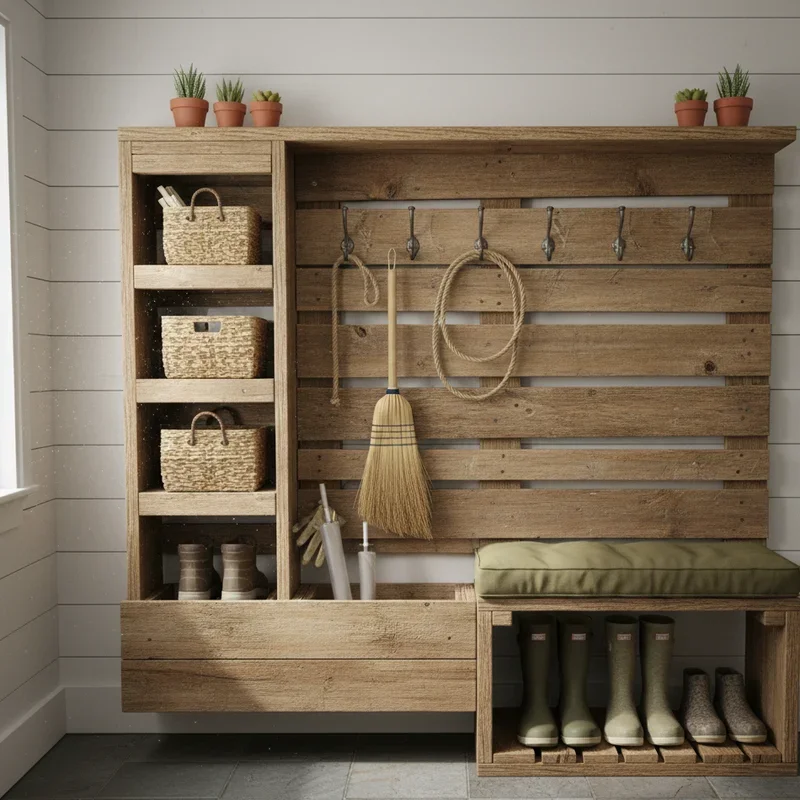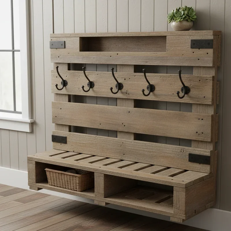 Conquer entryway chaos with a comprehensive pallet mudroom station that corrals coats, shoes, bags, and all the daily essentials threatening to overtake your entrance! Create a multi-level system using stacked and arranged pallets, incorporating benches, hooks, cubbies, and shelves into one cohesive unit. Include a bench section low enough for sitting while removing shoes, with storage underneath for footwear. Add hooks at various heights accommodating adults' coats and children's backpacks. Incorporate cubby sections using pallet divisions for individual family member storage. Install a top shelf for baskets holding gloves, hats, or seasonal accessories. Paint or stain the entire unit for polish, perhaps using different colors for each family member's designated section. Add chalkboard paint panels for writing reminders or schedules. This command center transforms your mudroom from disaster zone to organized haven, making daily routines smoother while maintaining the rustic charm that makes your house feel like home.