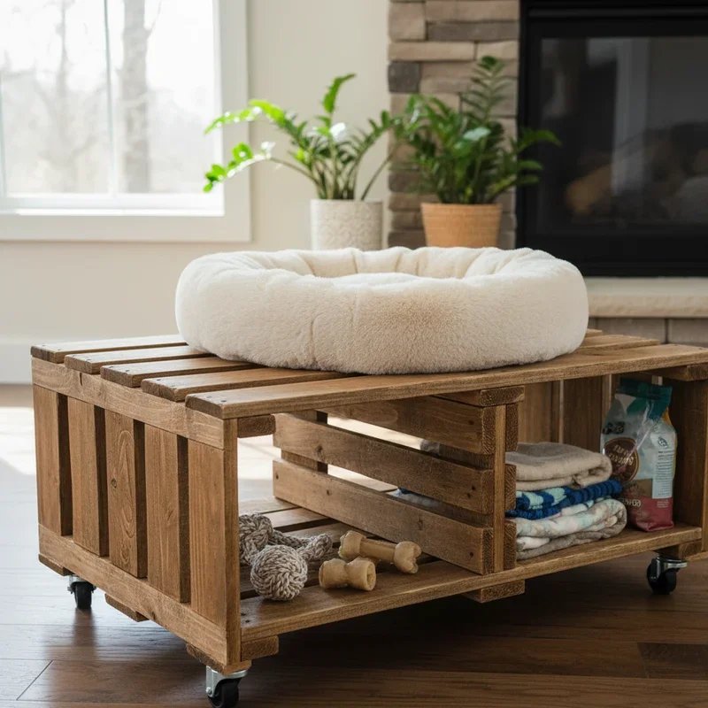 Spoil your furry friend while maintaining your home's style with a custom pet bed that doubles as clever storage! Use a pallet as the base structure, either keeping it low-profile for small pets or stacking for larger dogs. Sand everything smooth to protect paws and create a comfortable surface. Add a plush cushion on top sized perfectly for your pet. The underneath space or gaps within the pallet create built-in storage for pet supplies: toys, leashes, grooming tools, or food containers. Personalize it by painting your pet's name, adding decorative stencils, or coordinating colors with your room's palette. Attach caster wheels for easy moving during cleaning. This project shows you care about your pet's comfort while refusing to sacrifice your design aesthetic for generic pet products. Your four-legged family member gets a special spot that's truly theirs, while you gain organization and style simultaneously.