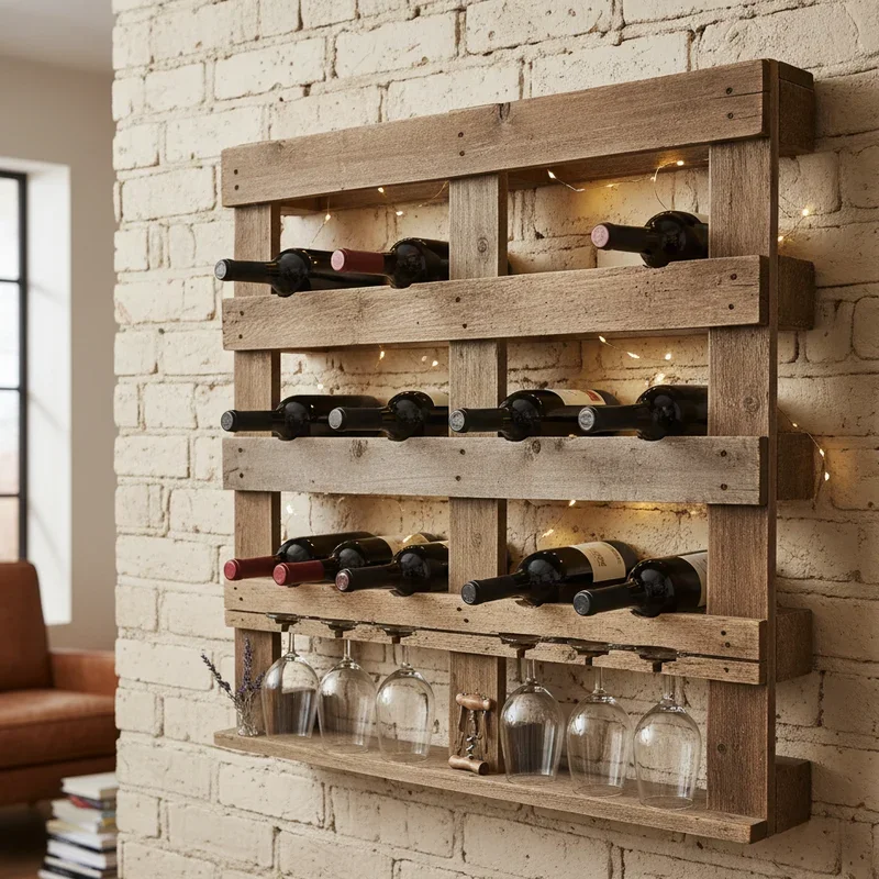 Wine lovers, rejoice! Create a sophisticated wine storage solution that displays your collection like art while keeping bottles perfectly positioned. Cut a pallet section to your desired size, then modify it to hold bottles horizontally in the gaps between slats. Sand thoroughly to prevent splinters near your precious bottles. Mount securely to your wall, ensuring it can handle the weight of filled bottles. Add a top shelf for displaying glasses, creating a complete wine station. The rustic wood pairs beautifully with wine's traditional aesthetic, evoking European cellar charm. You might stain it deep mahogany for classic elegance or paint it to match your kitchen's color scheme. Position it in your dining room, kitchen, or even a hallway to create a conversation piece that's functional art. This project impresses guests while solving the practical problem of proper wine storage without expensive specialized racks.