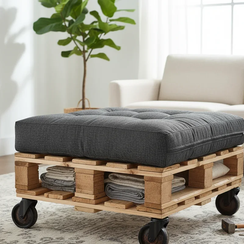 Merge seating, storage, and style into one brilliant piece with a pallet ottoman that works overtime in any room! Select a pallet section sized appropriately for ottoman proportions, typically square or rectangular. Add a hinged lid to the top using additional pallet boards, creating access to storage below. Sand all surfaces smooth, then finish the exterior to match your décor. Attach furniture legs or leave it low-profile depending on your aesthetic preference. Top the lid with thick foam cushioning, wrapping it in durable upholstery fabric that complements your color scheme. This versatile piece stores blankets in living rooms, toys in playrooms, or extra linens in bedrooms while providing extra seating when guests visit. The hidden storage keeps spaces tidy while the cushioned top offers comfort. Make several to create modular seating arrangements that adapt as your needs change, proving small furniture can deliver big impact.