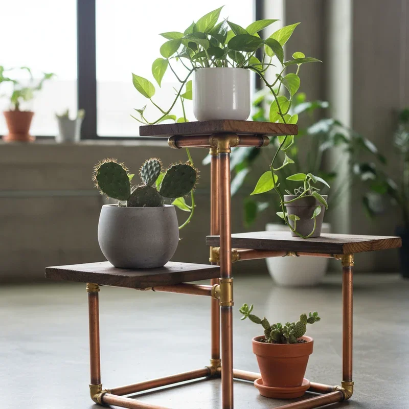 Copper pipes aren't just for plumbing anymore! This industrial-chic stand combines functionality with that trendy metallic shine everyone's crazy about. Gather copper pipes, elbow joints, T-joints, and a pipe cutter from your hardware store. No soldering required; simply cut pipes to desired lengths and connect with joints using pipe cement. Create geometric shapes like triangles or hexagons for visual appeal. The copper naturally develops a beautiful patina over time, adding character to your space. Build multiple heights to create a stunning display for various plant sizes. Add wooden or marble shelves between pipes for extra surfaces. This project typically costs around forty dollars but looks like a high-end boutique piece. The modular design means you can reconfigure it whenever you want a fresh look.