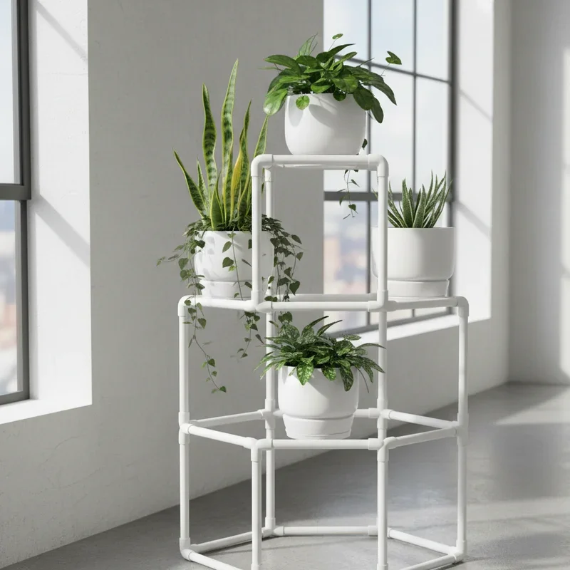 Think PVC pipes are just for plumbing? Think again! This contemporary tower design creates vertical growing space with a surprisingly sleek appearance. Cut PVC pipes at various lengths, connect with T-joints and elbows to create geometric frames. Spray paint in matte black or white for a modern look that hides the pipe's utilitarian origins. Add wooden or acrylic shelves at different levels for your plants. The lightweight construction makes it easy to move, while the waterproof material means no worry about water damage. Create a single tower or connect multiple units for a room divider effect. This project costs around twenty-five dollars and assembles without any special tools. The modular design grows with your collection, and you can disassemble it for easy moving or storage.