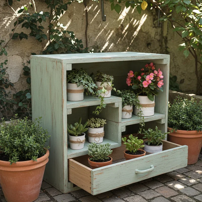 Those old dresser drawers deserve a second life as charming plant displays! Remove drawers from damaged furniture, sand, and refinish to your taste. Arrange drawers at different heights using wooden blocks or legs, creating stepped gardens perfect for showcasing collections. Line with plastic for direct planting or use as decorative containers for potted plants. Paint insides with bright colors for surprise pops when viewing from above. Stack drawers pyramid-style for compact vertical gardens or spread them out for horizontal displays. Add wheels for mobile gardens that follow seasonal light. Vintage drawers add instant character, while modern ones offer clean lines. This project costs virtually nothing when using salvaged materials, just paint and finishing supplies. Each drawer tells a story while providing perfect contained gardens for themed plant groupings.