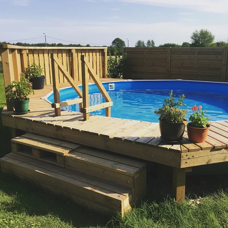 Elevate your basic above-ground pool into a stunning backyard centerpiece by building a custom deck around it! This transformation makes an ordinary pool feel like an in-ground installation at a fraction of the cost. Design multi-level decking to create visual interest and separate lounging areas from the pool entry. Use pressure-treated lumber or composite materials for durability against moisture and weather. Include built-in seating, planters, and storage compartments maximizing functionality. Install proper railings meeting local safety codes while maintaining aesthetic appeal. Create wide stairs for comfortable access and consider adding a gate for child safety. Integrate lighting into deck posts and steps for evening ambiance. Leave access panels for pool equipment maintenance. This project dramatically increases your pool's usability and property value while providing space for entertaining. The deck effectively disguises the pool's above-ground nature while adding substantial outdoor living space.