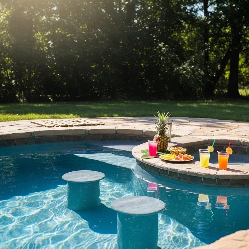 Build the ultimate entertainment feature with a DIY swim-up bar that brings resort luxury home! Construct a bar structure along one pool edge using concrete blocks or weather-resistant wood framing. Install underwater bar stools anchored to pool floor or mounted to bar structure. Create a countertop overhang providing shade and splash protection for the dry side. Add a pergola or palapa roof for tropical ambiance and sun protection. Install outdoor-rated refrigeration, sink, and storage on the dry side for convenient service. Include electrical outlets for blenders and sound systems, ensuring proper GFCI protection. Build in cup holders and towel storage for swimmer convenience. This addition transforms pools into entertainment destinations where swimmers and non-swimmers interact comfortably. The social aspect extends pool use beyond exercise, creating a true backyard resort experience.