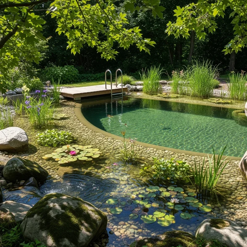 Build an eco-friendly swimming paradise that mimics nature's own design with a natural pool system! This chemical-free alternative uses aquatic plants and natural filtration to keep water crystal clear without harsh chemicals. Divide your pool into swimming and regeneration zones, with the latter filled with gravel and water plants that naturally filter the water. Excavate the area yourself or rent equipment, then line with EPDM rubber or bentonite clay for waterproofing. Install a pump system to circulate water between zones, ensuring proper filtration. Add rocks, pebbles, and marginal plants around edges creating a pond-like appearance. The result looks like a pristine mountain lake dropped into your backyard. While initial construction requires more effort than traditional pools, maintenance becomes easier over time as the ecosystem establishes itself. This sustainable option attracts wildlife, reduces chemical exposure, and creates a unique swimming experience.