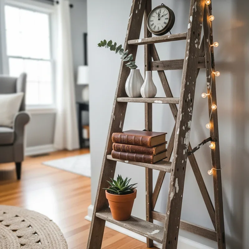 Repurpose old wooden ladders into unique display systems that add vertical storage with vintage charm. Ladders are instant character additions! Lean against walls for blanket storage in living rooms or towel display in bathrooms. Suspend horizontally from ceiling for pot racks in kitchens or plant displays in sunrooms. Sand and stain for refined look or leave weathered for authentic rustic appeal. Add boards across rungs for shelf surfaces that hold books, plants, and decorative objects. Paint in bold colors for modern twist on vintage functionality that pops against neutral walls. The versatility means one ladder serves different purposes as your needs change over time. Your ladder shelf becomes a flexible display solution that adapts while maintaining decorative impact.