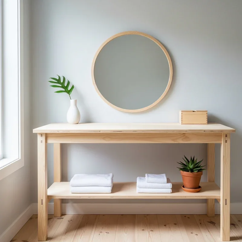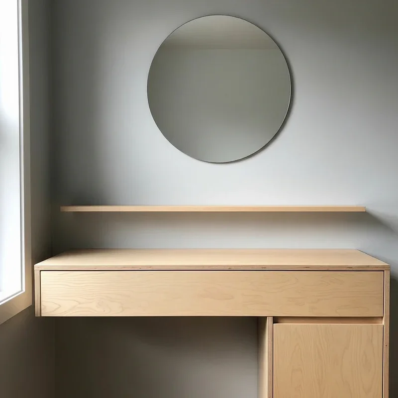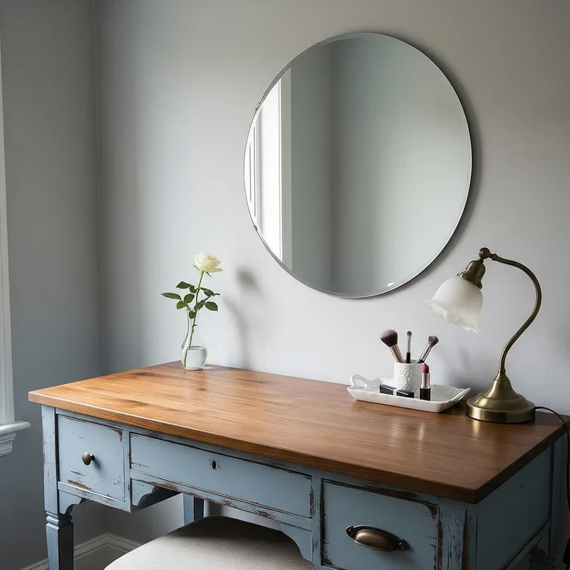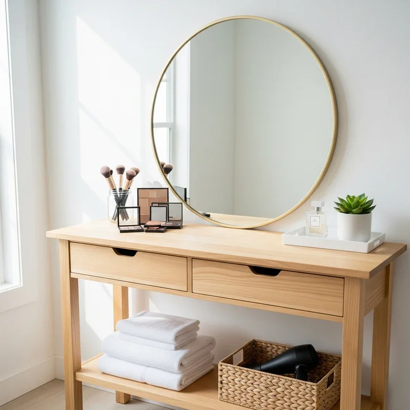 Create a serene Scandinavian-inspired vanity that embraces simplicity while maintaining complete functionality. Less really can be more! Choose light wood or white painted furniture for that signature Nordic aesthetic appeal. Keep surfaces mostly clear with just a few carefully selected items on display. Use drawer organizers and hidden storage to maintain the clean, uncluttered look consistently. Add a single plant and perhaps one piece of simple artwork for personality. The mirror should be frameless or have a thin, simple frame for minimalist elegance. Include soft textiles like a sheepskin rug or linen cushion for hygge comfort. Your Scandinavian vanity becomes a calming space that reduces morning stress through simplicity.