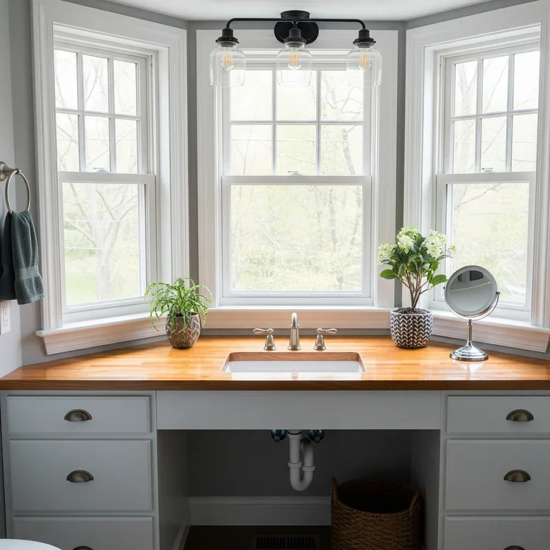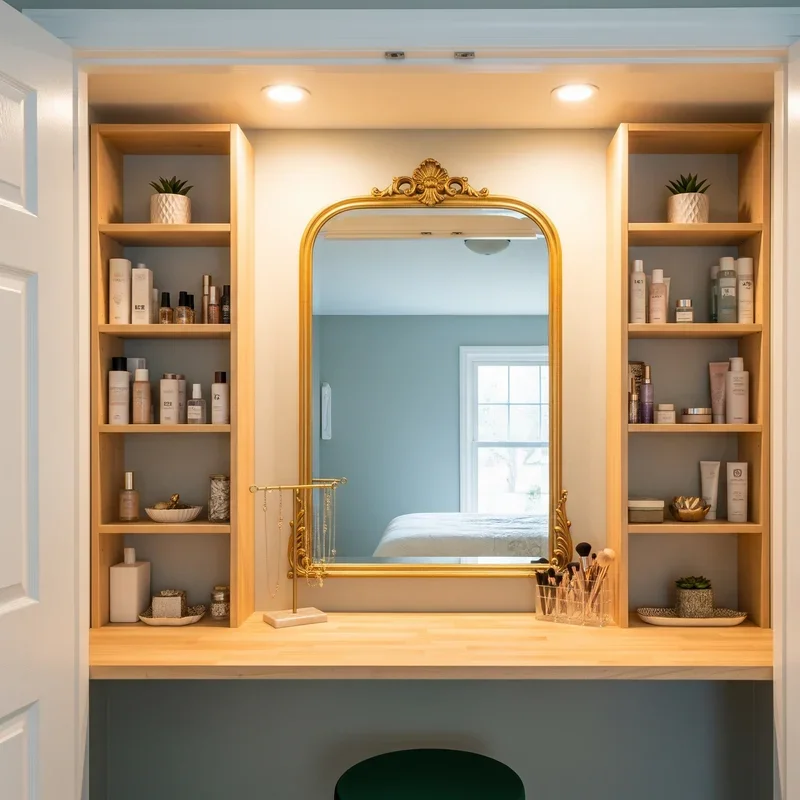 Transform that sunny window nook into a naturally lit vanity space that makes you glow. Natural light is makeup's best friend! Build or place a small table that fits perfectly in your window alcove space. The natural light eliminates color-matching disasters and provides the most accurate makeup application. Add sheer curtains for privacy while maintaining that beautiful, diffused lighting quality throughout. Position mirrors to maximize light reflection without creating unflattering shadows on your face. Include plants on the windowsill for a fresh, spa-like atmosphere during your routine. Built-in window seats can double as storage benches for beauty supplies below. Your window vanity becomes a bright spot that makes morning routines genuinely enjoyable.