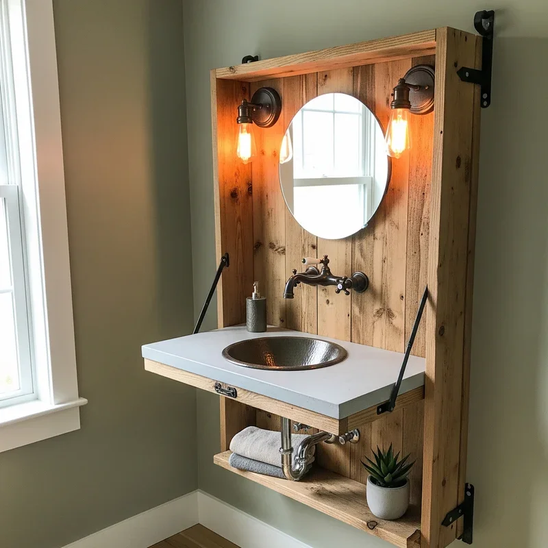 Create a disappearing vanity that folds flat against the wall when not in use, perfect for studio apartments. This transformer furniture maximizes every square foot! Build a hinged table that mounts to wall studs for security and stability. Include a mirror on the underside that reveals itself when the table folds down. Add small shelves or magnetic strips on the wall portion for items used daily. The table surface should be deep enough for comfort but not so large it's cumbersome. Install soft-close hinges to prevent slamming and protect walls from damage over time. Paint it to match your walls for seamless integration when closed and stored. Your fold-down vanity provides full functionality when needed, then virtually disappears to maintain spaciousness.