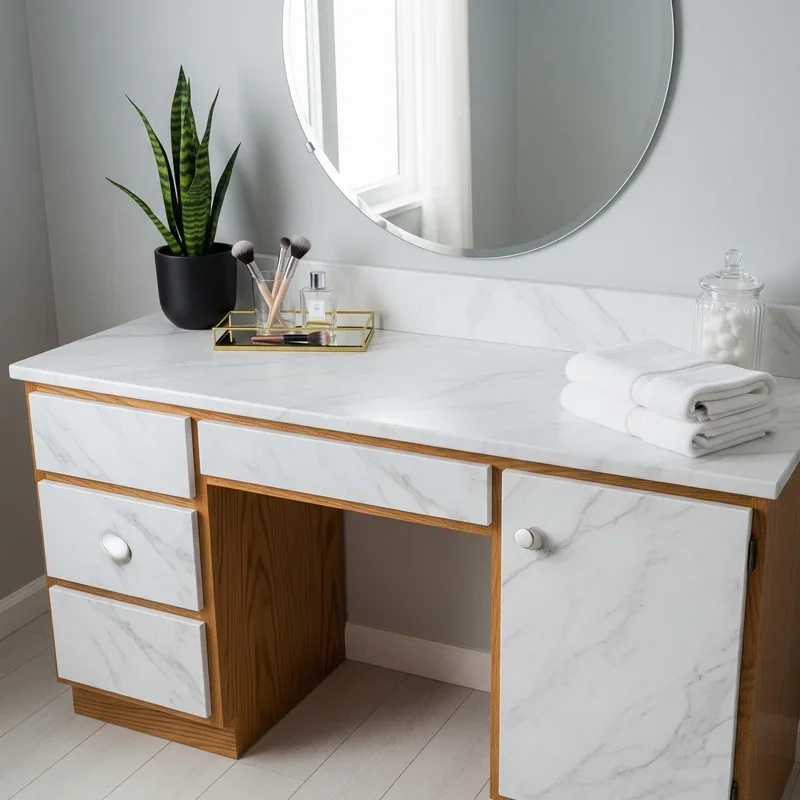 Give any basic vanity an expensive makeover using marble contact paper that looks surprisingly realistic. This budget hack creates luxury looks! Clean and lightly sand your vanity surface for optimal adhesion before starting application. Measure carefully and cut pieces slightly larger than needed for adjustment room during installation. Apply slowly, using a credit card to smooth bubbles as you work across surfaces. Create seamless corners by carefully overlapping and trimming excess with sharp blades. Seal edges with clear caulk for water resistance and professional-looking finish quality. The transformation works on tabletops, drawer fronts, and even mirror frames for cohesion. Add gold or brass hardware to enhance the luxurious marble effect even further. Your marble makeover achieves high-end aesthetics without breaking your renovation budget.