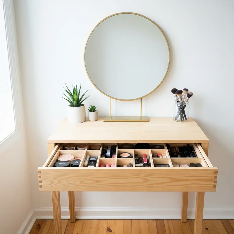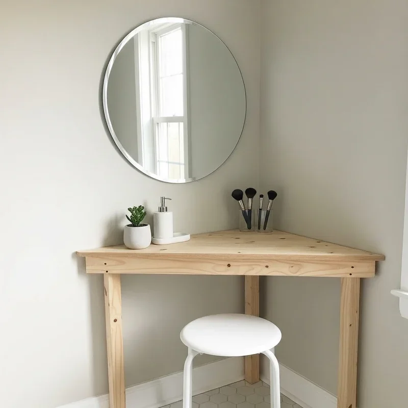 Maximize that awkward corner space by creating a custom vanity that fits perfectly where nothing else would. Corners are goldmines for small space dwellers! Build a triangular shelf system or purchase a corner desk to establish your foundation. The angled design naturally creates zones for different beauty categories without feeling cluttered. Mount corner shelves above for vertical storage that doesn't encroach on precious floor space. A corner-mounted mirror bounces light around, making the space feel larger and brighter. Add a compact stool that tucks completely under when not in use. Install battery-operated LED lights if electrical outlets are scarce in your corner. Use clear acrylic organizers to maintain visual lightness while keeping everything accessible. Your corner vanity proves that every inch of your home can be both beautiful and functional.