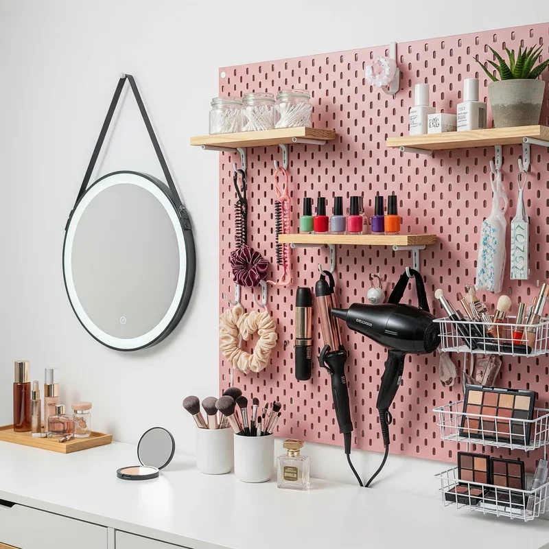 Install a pegboard system that turns your vanity wall into a customizable organization wonderland. Pegboard is the ultimate flexible storage solution! Paint the pegboard in a color that complements your room or creates an accent wall. Arrange hooks, baskets, and shelves that can be reconfigured whenever your needs change. Hang frequently used tools like hairdryers and straighteners for easy access and cooling. Small containers attached to pegboard hold brushes upright and visible for quick selection. Create a inspiration board section with photos, quotes, or color swatches for creativity. The vertical storage keeps vanity surfaces clear while displaying products beautifully like artwork. Your pegboard system grows and adapts with your changing beauty routine and collection.
