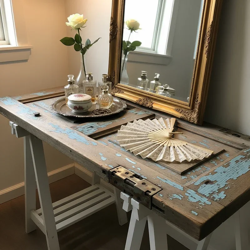 Transform an old door into a unique vanity table that's both eco-friendly and absolutely unique. One person's trash becomes your treasure! Sand and paint or stain the door to match your desired aesthetic perfectly. Add hairpin legs or repurposed table legs for the right height and stability. The door's panels create natural sections for organizing different beauty categories effectively. Glass cut to fit protects the surface while maintaining the door's character underneath. Door knobs can become towel holders or jewelry hangers for added functionality. The length provides ample surface area for spreading out your entire beauty collection. Your door vanity becomes a sustainable statement piece that sparks conversations.
