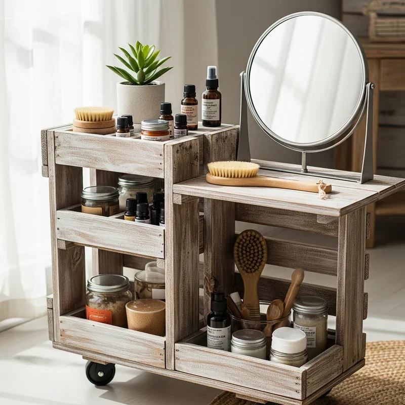 Build a mobile vanity cart that rolls wherever you need it, from bedroom to bathroom effortlessly. Mobility means maximum flexibility! Start with a bar cart or utility cart as your foundation for instant structure. Add organizer trays on each level to prevent items from rolling around during movement. The top tier holds daily essentials while lower levels store backup products and tools. Attach a battery-powered mirror with lights to the cart for complete portability. Include cord management solutions for hot tools that need nearby outlet access. The wheels lock in place when you've found your perfect getting-ready spot. Your rolling vanity adapts to different lighting conditions and room availability as needed.