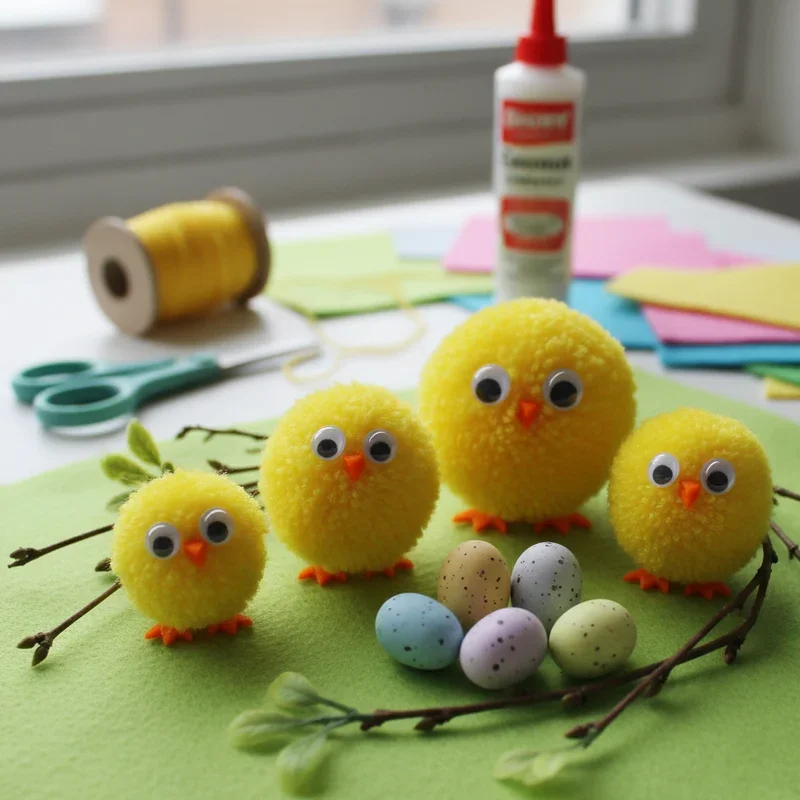 Fluffy yellow pom-poms transform into the cutest Easter chicks with just a few simple additions. Using store-bought pom-poms or homemade yarn versions, add orange felt beaks, googly eyes, and tiny orange paper feet. These adorable chicks can perch anywhere, from Easter baskets to place cards, spreading cheerful spring vibes. Making pom-poms from scratch teaches patience and fine motor skills as kids wrap yarn repeatedly around cardboard forms. The satisfying fluff that emerges after cutting feels like magic every time. Create different sized chicks for a whole family, or use various yellow shades for visual interest. These lightweight decorations travel well, making them perfect for Easter gifts to distant relatives. Set up a chick assembly line where each person handles one element, turning crafting into quality family bonding time.