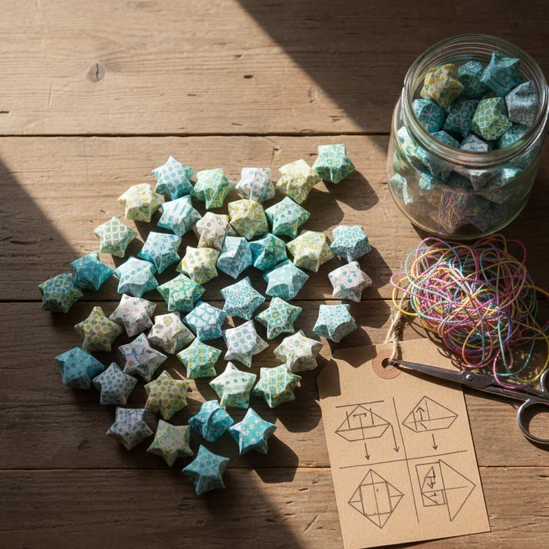 Transform simple paper squares into three-dimensional stars that sparkle without electricity! These modular origami stars require no glue or cutting, just precise folding and patience. Start with origami paper or cut squares from magazines, wrapping paper, or scrapbook paper. Each star needs five identical units that slot together forming dimensional points. The repetitive folding becomes meditative while your collection grows. String stars into garlands, fill bowls for centerpieces, or attach to gifts as decorative elements. Make tiny stars from Post-it notes during boring meetings or giant ones from poster board for parties. The color combinations are endless; try gradients, complementary colors, or festive themes. These stars work year-round, not just holidays. Kids develop spatial reasoning and fine motor skills while creating. Your windowsill will twinkle with paper constellations that never need batteries!