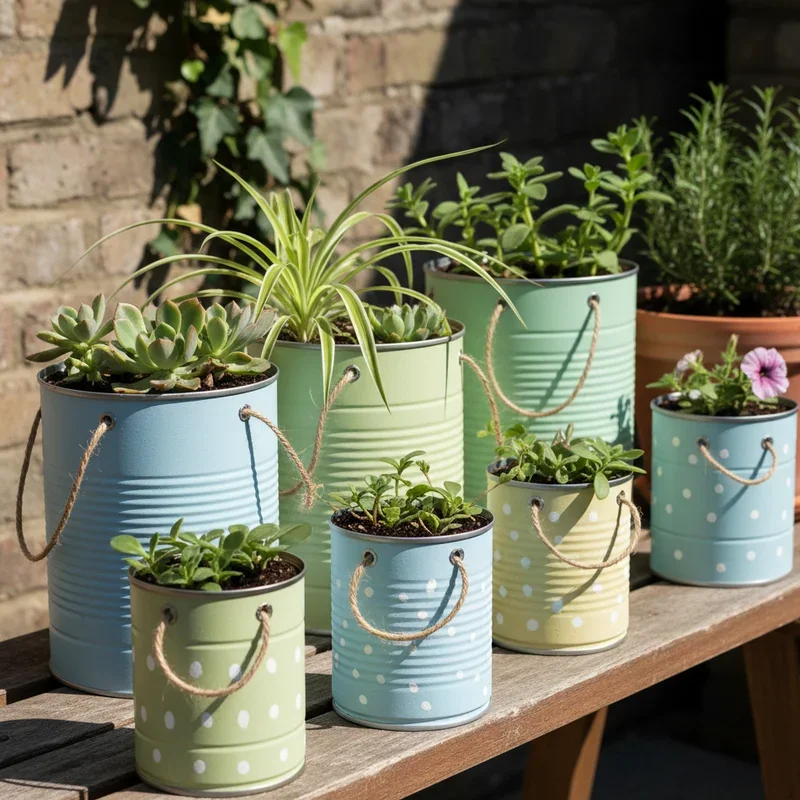 Save those soup cans from recycling and give them glamorous garden makeovers! Clean cans thoroughly, then transform with paint, fabric, rope, or paper. Drill drainage holes for healthy plants or use as cachepots for plastic nursery pots. Wrap cans in twine for rustic charm, decoupage with vintage papers for shabby chic, or spray paint metallic for modern elegance. Create hanging gardens by adding wire handles or group different sizes for tabletop displays. These planters perfectly fit herbs, succulents, or small flowers. Label cans with plant names using chalkboard paint or tags. Kids enjoy decorating their own planters and watching seeds grow. The uniform size makes organizing windowsills easy while recycling reduces waste. String lights through grouped cans for magical evening ambiance. Your trash literally becomes treasure while your plants get stylish new homes!