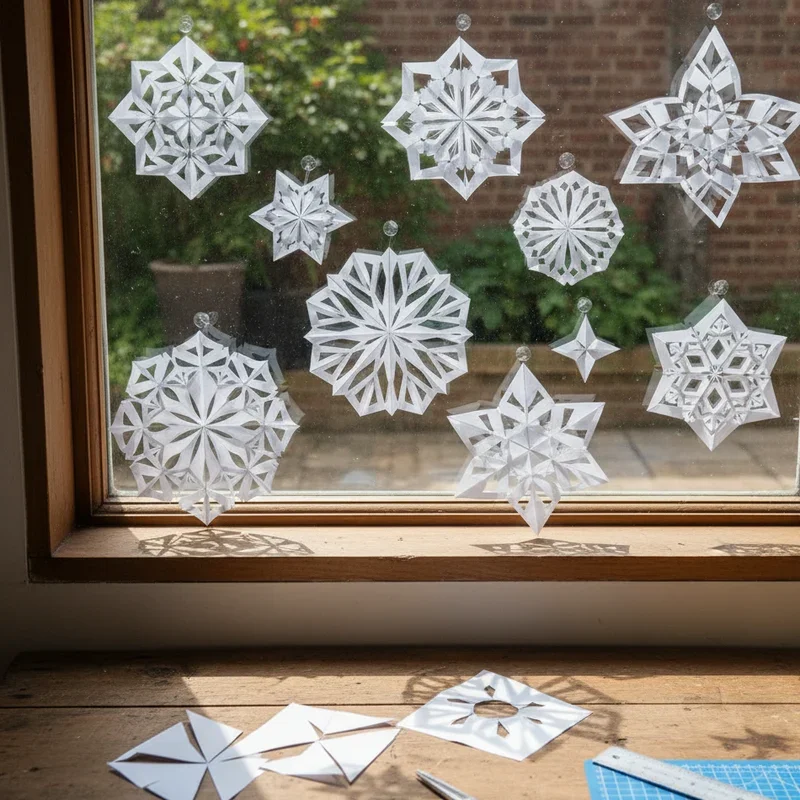 Like origami's rebellious sibling, kirigami adds cutting to folding, creating intricate designs that cast beautiful shadows! Unlike random cutting, kirigami follows specific patterns creating connected designs that unfold into geometric mandalas or pictorial scenes. Start with simple symmetric cuts, then advance to architectural kirigami creating 3D structures from flat sheets. Window placement transforms these into dynamic art as sunlight creates moving shadow patterns throughout the day. Seasonal designs change your window display easily: snowflakes for winter, flowers for spring, leaves for fall. The negative space becomes as important as the paper itself, teaching design principles about balance and composition. Use colored tissue paper for stained glass effects, or white paper for subtle elegance. These decorations photograph beautifully, creating Instagram-worthy backgrounds that cost literally cents to make.