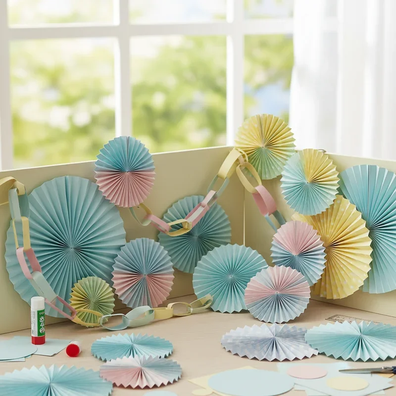 These aren't your grandma's funeral home fans; modern paper fans are having a serious decorative moment! The accordion fold technique transforms flat paper into dimensional art that works as both functional cooling devices and stunning wall decor. Start with basic folds, then experiment with cutting patterns into the folded edges for lace-like effects when opened. Glue two fans together for full circles that become rosettes, or keep them semicircular for that classic fan shape. Decorative papers, maps, or sheet music add personality, while metallic papers create glamorous party decorations. The size possibilities are endless: tiny fans for cupcake toppers or giant ones for dramatic backdrops. Master the basic technique, then add wooden handles for practical use or create layered fans with multiple papers for rainbow effects. They're perfect for weddings, parties, or adding texture to gallery walls.