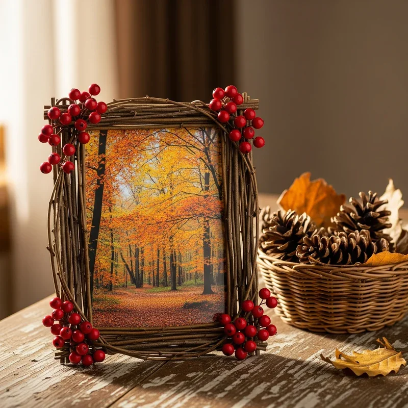 Transform ordinary frames into rustic autumn masterpieces using materials gathered from your own backyard. Start with plain wooden frames from dollar stores or thrift shops, giving you an affordable base for transformation. Collect small twigs of similar thickness, cutting them to frame-width lengths with pruning shears for clean edges. Attach twigs horizontally or create patterns using hot glue, building layers for dimensional interest. Fill gaps with smaller elements like acorns, small pinecones, or dried berries, creating organic compositions that celebrate nature's variety. Spray paint everything in metallic tones like copper or gold for elegant finish, or leave natural for rustic appeal. Add preserved moss or lichen for texture contrast and visual softness against hard elements. These frames beautifully display autumn family photos or seasonal artwork. Create cohesive gallery walls by making multiple frames with slight variations, maintaining consistent color schemes while varying natural elements for individual character that ties the collection together.